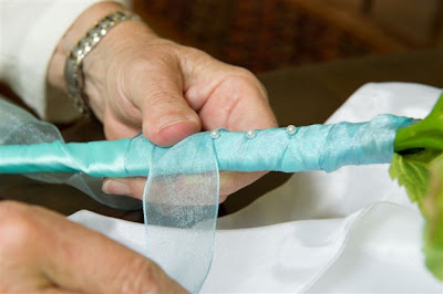 These are some of the wonderful ribbons I’ve used in recent weddings. They function beautifully as links connecting bridal and bridesmaid’s bouquets and boutonnieres.